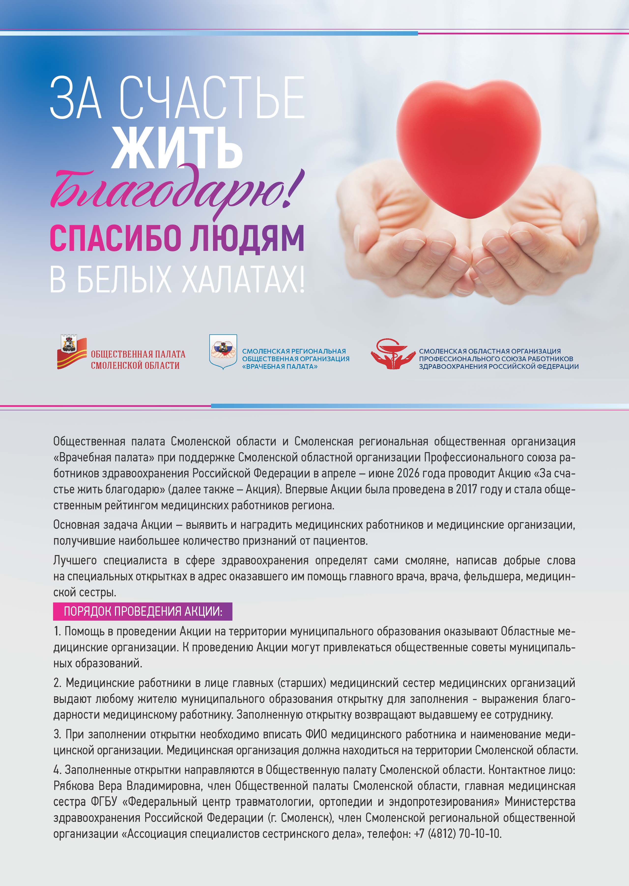 Общественная палата Смоленской области и Смоленская региональная общественная организация «Врачебная палата» при поддержке Смоленской областной организации Профессионального союза работников здравоохранения Российской Федерации в апреле-июне 2026 года проводит Акцию «За счастье жить благодарю» (далее также – Акция). Впервые Акция была проведена в 2017 году и стала общественным рейтингом медицинских работников региона.