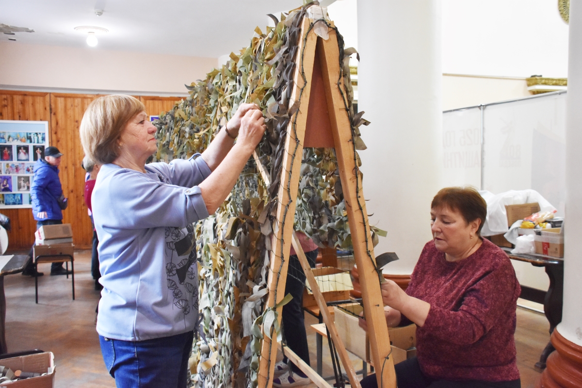 Наши герои - волонтеры, изготавливающие маскировочные сети в Центральном Дворце культуры.
