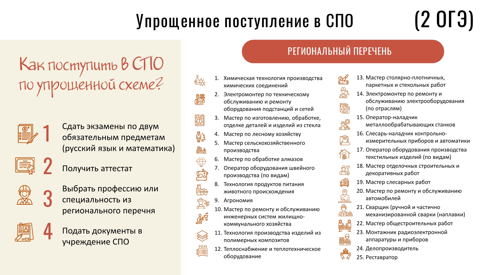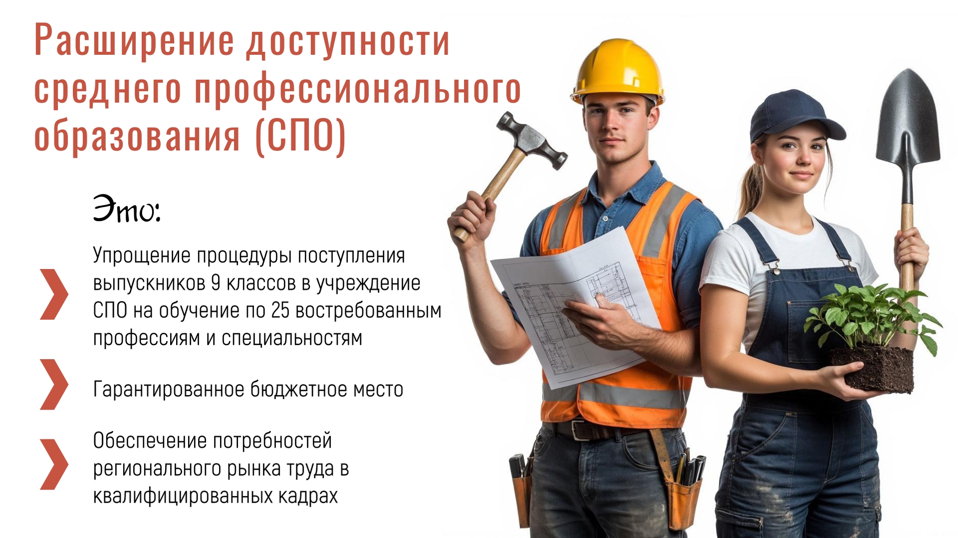 Расширение доступности среднего профессионального образования (СПО) это: Упрощение процедуры поступления выпускников 9 классов в учреждение СПО на обучение по 25 востребованным профессиям и специальностям; Гарантированное бюджетное место; Обеспечение потребностей регионального рынка труда в квалифицированных кад.