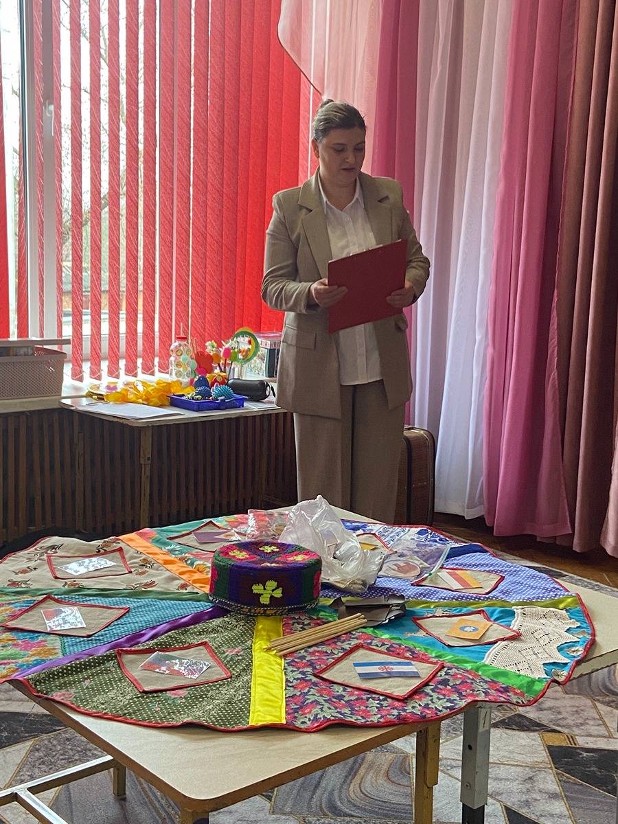 Мартова Надежда Сергеевна, воспитатель детского сада № 10 провела с участниками мероприятия фрагмент познавательного занятия «Если мы едины, мы - непобедимы!». Она использовала многофункциональное пособие «Круг дружбы и добра», с помощью которого участники фестиваля совершили путешествие в Республику Саха (Якутию), Татарстан, Северный Кавказ (в состав которого входит 7 республик и 2 края) и познакомились с живущими там народами.