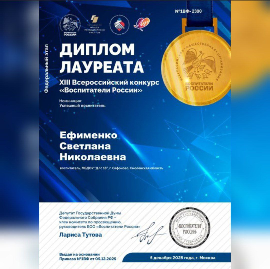 Светлана Николаевна Ефименко, воспитатель МБДОУ «Детский сад № 18 «Аленка» г. Сафоново, победитель регионального этапа XIII Всероссийского конкурса «Воспитатели России» в номинации «Успешный воспитатель», приняла участие в Торжественной церемонии награждения победителей, которая состоялась в г. Москва.